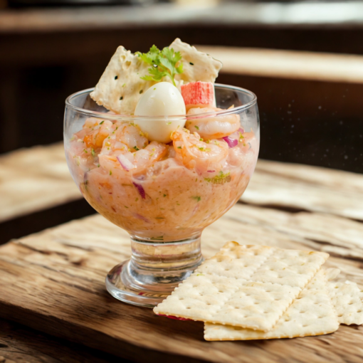 Ceviche de camarón preparado con salsa de tomate, salsa mayones, cebolla y cilantro. Acompañado de palmitos y galletas de soda. Refrescante, cremoso y lleno de sabor.