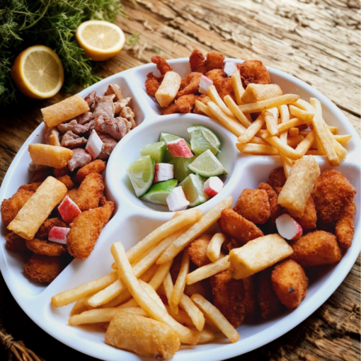 Una combinación perfecta de camarones, calamar, pollo y carne de cerdo, acompañada de papas y yuca crocante. Abundante y llena de sabor.