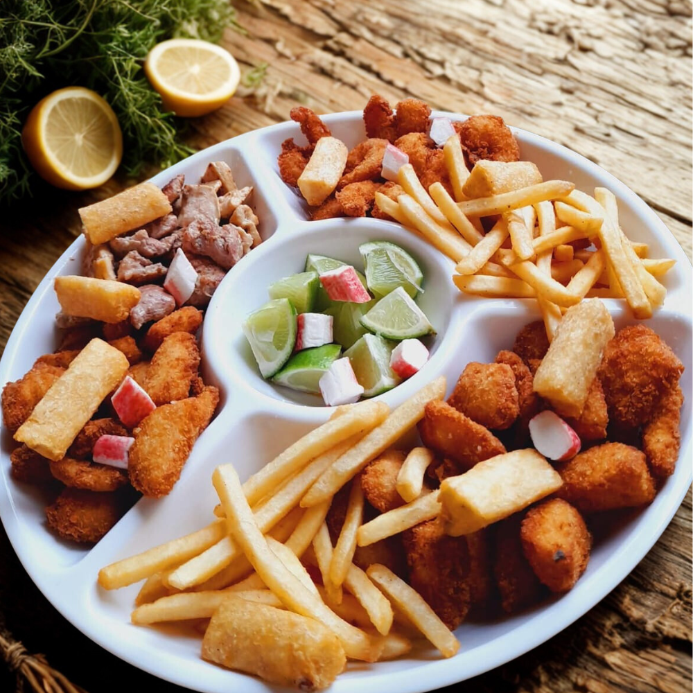 Una combinación perfecta de camarones, calamar, pollo y carne de cerdo, acompañada de papas y yuca crocante. Abundante y llena de sabor.